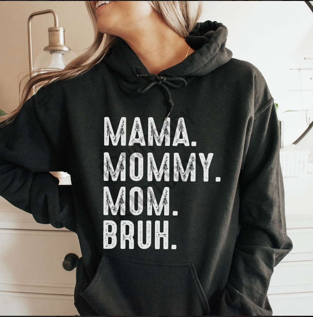 Black long sleeve 100% cotton t shirt with the progression of the term Mama